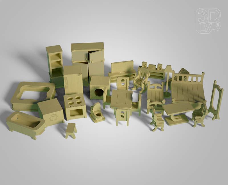 Собирается очень просто и без клея на фиксаторах по прилагаемой схеме. Собранную мебель можно раскрасить любыми красками. Мебель имеет подвижные части - открываются двери шкафа, холодильника, стиральной машины и т.п.