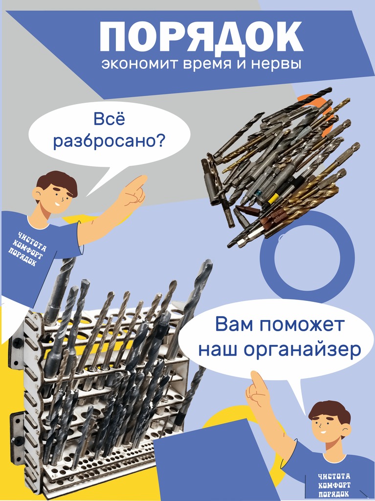 Забудьте о поиске нужного сверла среди беспорядка! Наш настенный органайзер — идеальное решение для аккуратного хранения и быстрого доступа к инструментам. Прочная конструкция и продуманное расположение гнёзд позволяют разместить свёрла разных диаметров в порядке возрастания — всё под рукой и на виду.
