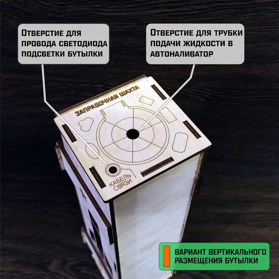 При вертикальном размещении бутылки на корпусе имеются сквозные вырезы для контроля уровня жидкости, на верхней части коробки вы найдете отверстие для установки трубки подачи жидкости в наливатор и отверстие для провода подсветки - можно установить LED подсветку бутылки для красоты и лучшего контроля уровня оставшейся жидкости.